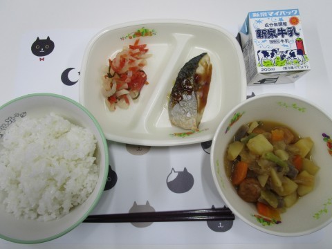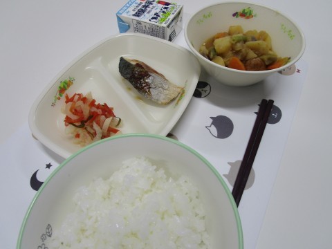 今日の給食は「ごはん,ぶりの照り焼き,紅白なます,魚菜天と野菜のうま煮」です。