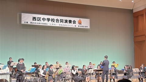 本日14時半より西区中学校合同演奏会にて、本校音楽部が出演しました。津久野中音楽部らしさをしっかりだすことができ、会場のみなさんも笑顔いっぱいでした。区長さんや本校区自治連合会の三連長さんも微笑ましく観覧されていました。