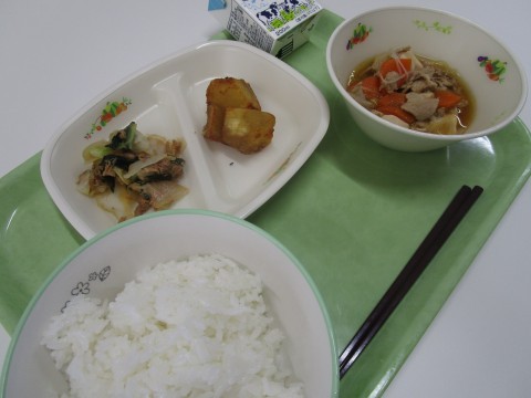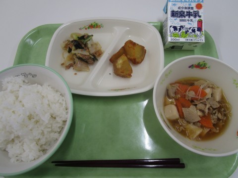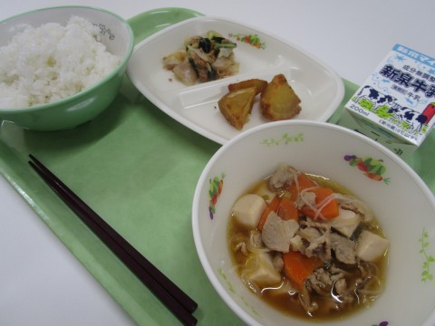 今日の献立は「ご飯・肉豆腐・大学いも・いそのサラダ」です。