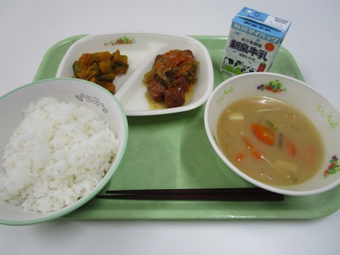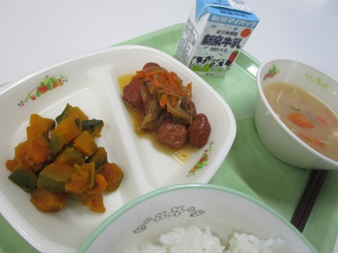本日,10月10日は目の愛護デーとのことで,ビタミンAを多く含んだかぼちゃを使った献立です。
