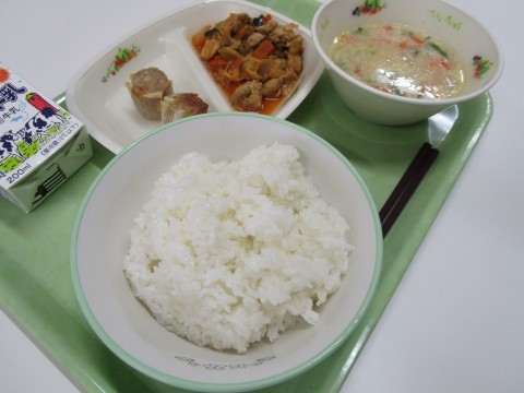 今日の献立は「ごはん,タッカルビ,焼シュウマイ,トック」です。