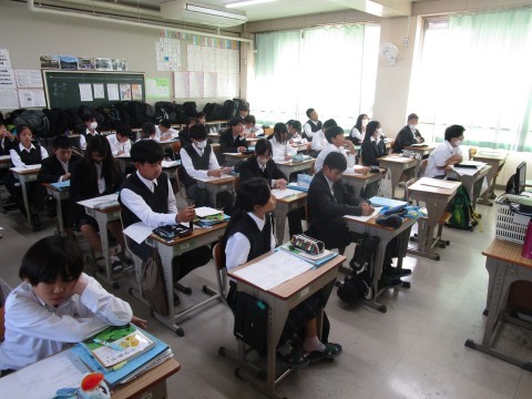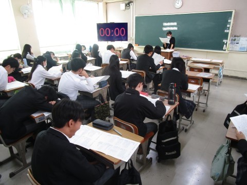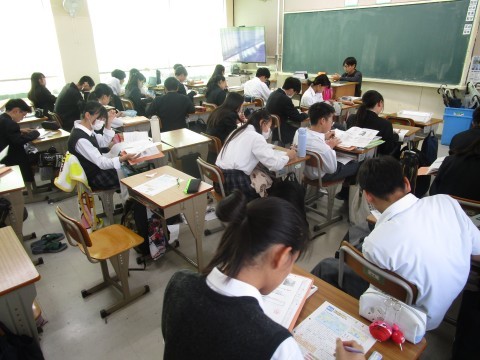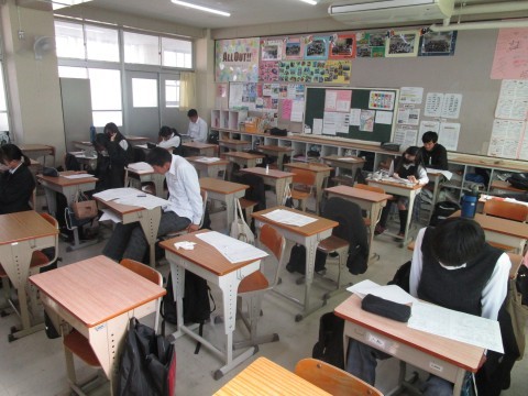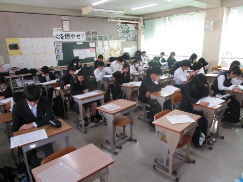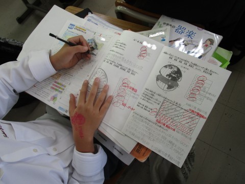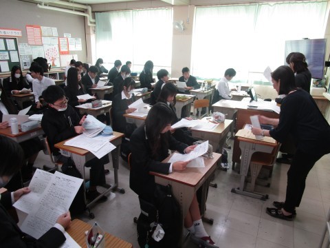 模範解答と自分の解答用紙を,じっくり見直しをしています。自分の得点を周りと比較しがちですが,この時期それにはあまり意味がありません。まず,内省が大切です。できなかったところを,いかに早く修正して自分のものにするかに力点を置いてください。