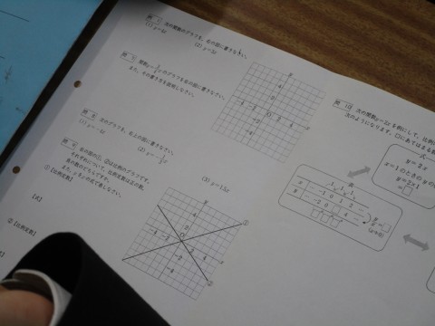 y=axという比例のグラフについて学習しています。こういう問題の場合,xとyの表を作って,それぞれに代入しながら座標の点を取っていきグラフに表していきます。今日の授業では,表を作らずにグラフを作っていってましたね。これから,学習が進んでいくとわざわざ表を作ってると時間が足らなくなってきたりします。今日の学習はしっかり復習しておきましょう。