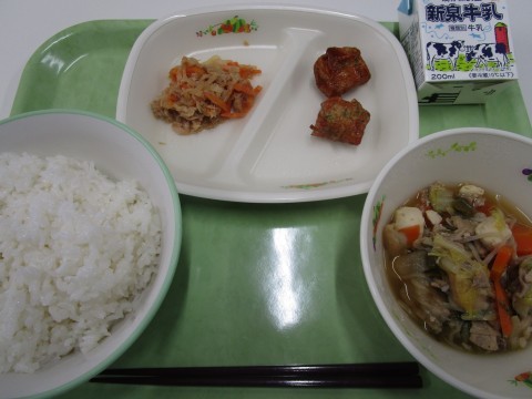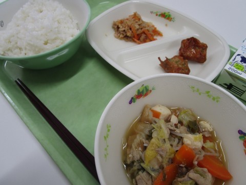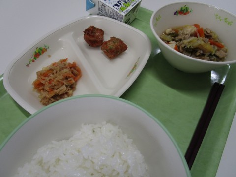 今日の献立は「ごはん,すき焼き,ちくわの磯部揚げ・大根サラダ」です。