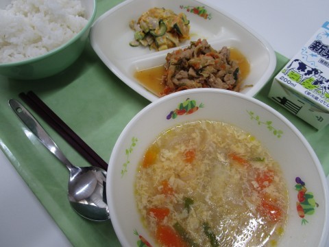 今日の献立は「ごはん,焼きギョウザ,麻婆きゃべつ春雨,中華スープ」です。中華メニューですね。