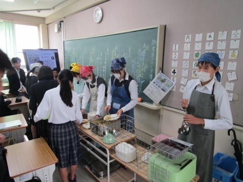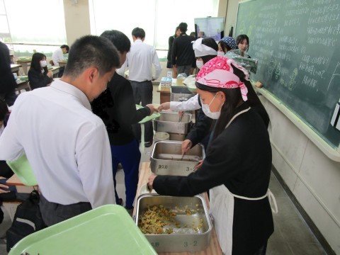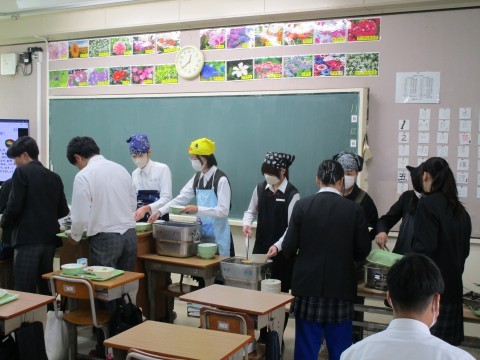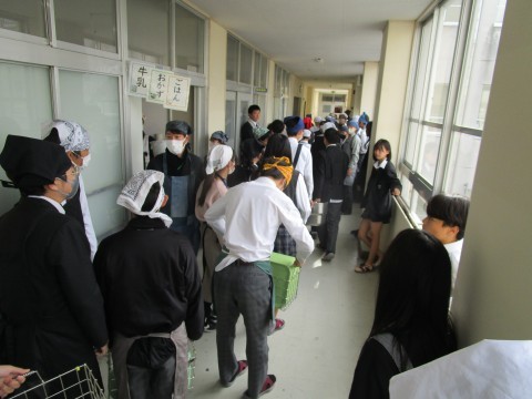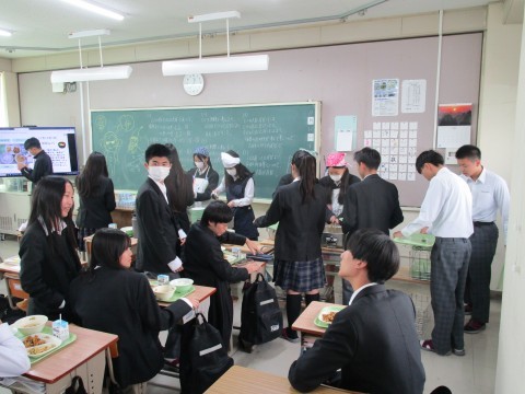 4時間目が終わると,手を洗いに行く人,給食当番でマスクやエプロンの準備に取り掛かる人が教室や廊下でいっぱいになります。給食当番の人たち,いつもありがとう。