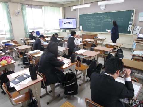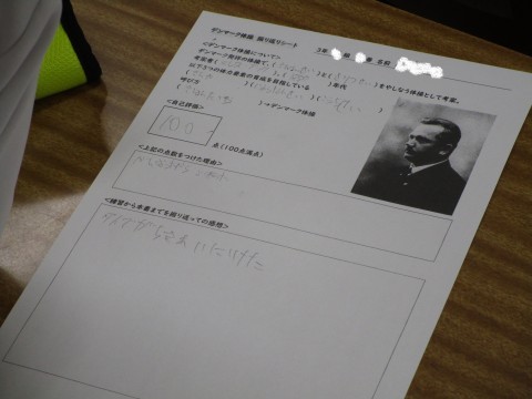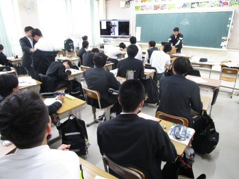 男子体育の授業では,3年生男子による集団演技「デンマーク体操」の振り返りを行っています。体育大会の映像を観て感想を書いていますが,映像を観ながら担当の先生もその時のことを思い出しながら笑い泣きしてました。