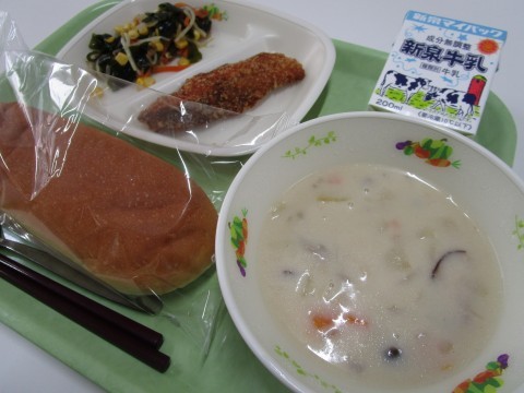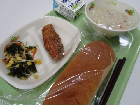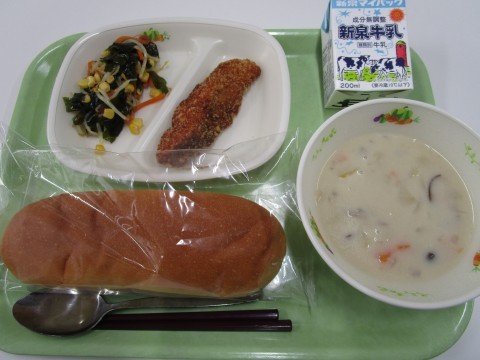 今日の献立は「コッペパン,キノコシチュー,ますフライ,わかめのサラダ」です。