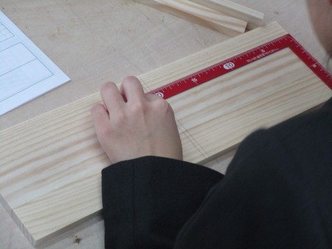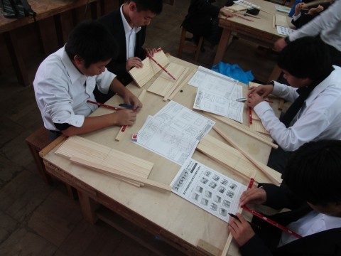 今回は材料にさしがねを用いてけがき線を引いていきます。子どもたちは集中しながらも慎重に線を引いていきます。教育委員会から専門指導の先生が来校され,授業を参観いただき指導助言をいただきました。