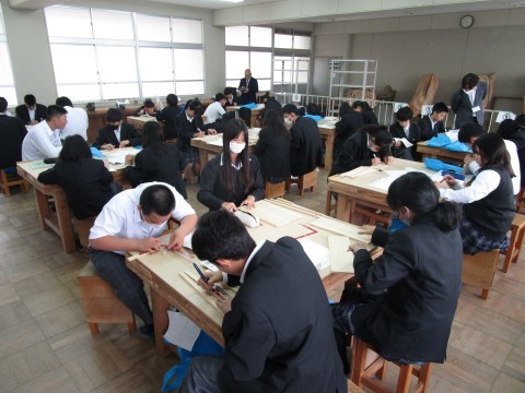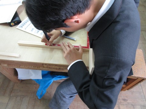 今回は材料にさしがねを用いてけがき線を引いていきます。子どもたちは集中しながらも慎重に線を引いていきます。教育委員会から専門指導の先生が来校され,授業を参観いただき指導助言をいただきました。