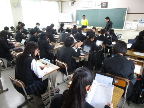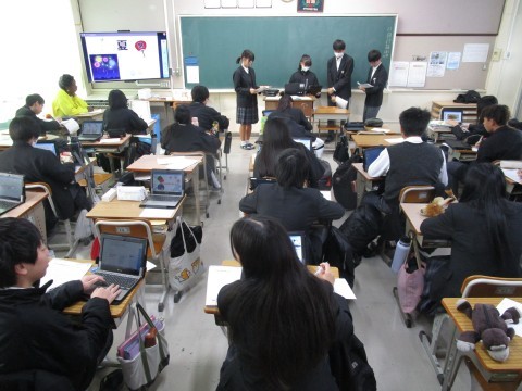 グループで考えた「NSの先生に日本の四季の楽しみ方を紹介しよう」の英文を,タブレットのPPでの映像などとともに発表しています。