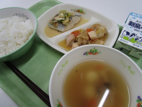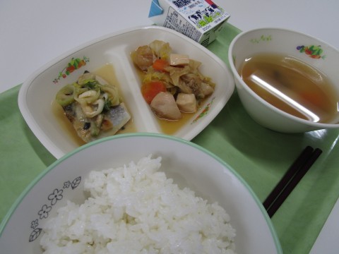 今日の献立は「ごはん,さわらのみそ焼き,鶏すき,すまし汁」です。