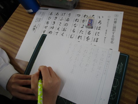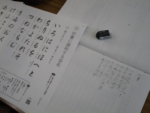行書に調和した仮名を,手本を見ながら慎重に書写していきます。