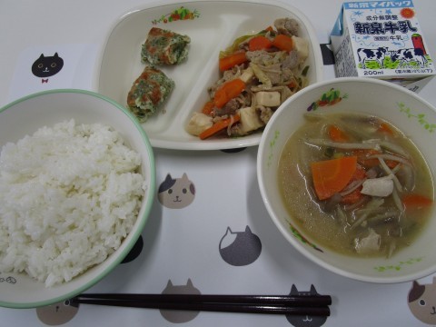 五目汁には鶏肉も入っており,豚肉(肉豆腐)のたんぱく質・ちくわ磯辺焼き(魚)のたんぱく質・豆腐(大豆)のたんぱく質と,給食の中でも1食あたりのたんぱく質量が豊富な献立です。ちなみに,今日の給食1食あたりのたんぱく質量は40.1gです。