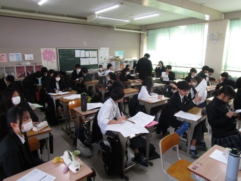 2日目のテストの様子です。期末テストは3日間です。1日1日のテストに集中し,その日のテストが終わって自宅へ戻ったら,切り替えて次の科目の準備に取り掛かりましょう。※画像は上から2・1組です。