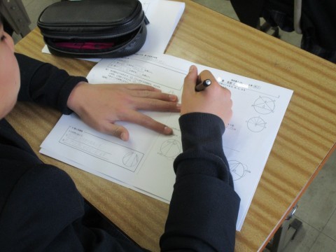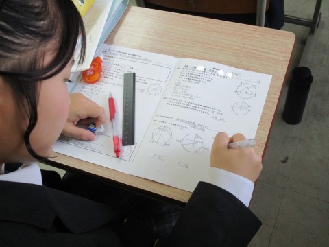 円の中心角と円周角の関係について学習しています。図形の問題で円が出てきたら,この定理や円の接線や接点に関する定理をまず思い出してください。この単元もよく高校入試に扱われます。