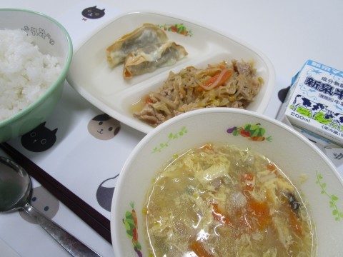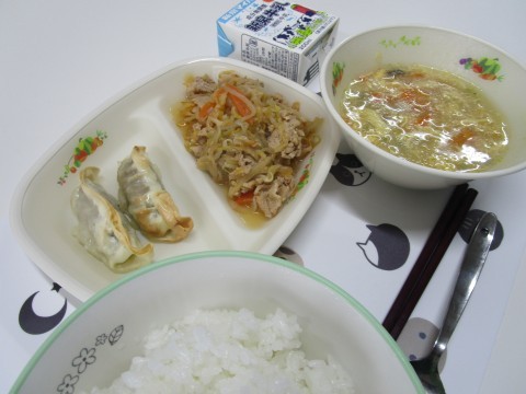 今日の給食は「ごはん,豚キムチ,焼き餃子,クッパ」です。