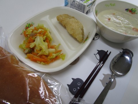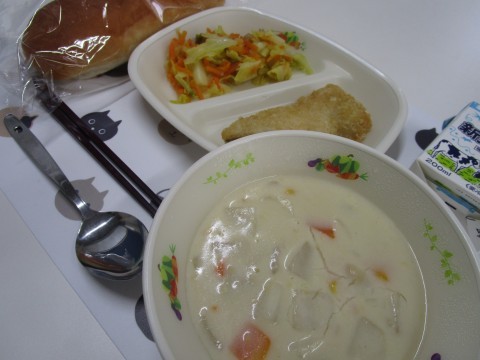 今日の給食は「コッペパン・かぶのシチュー・白身魚フライ・キャベツのソテー」です。