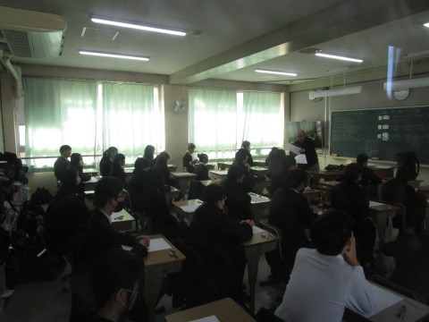 終わりのチャイムの直前に教室に入ったため授業は終了していました。最後のプリントに記入している生徒。書き終わった生徒は「写真撮って~」と。