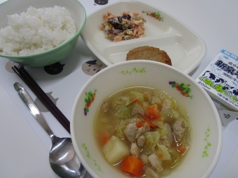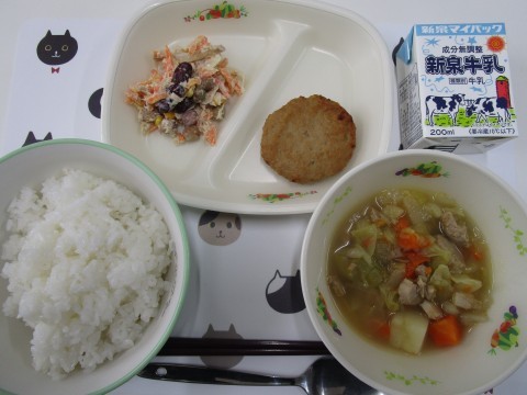 今日の給食は「ごはん,照り焼きハンバーグ,ビーンズサラダ,スープ煮」です。