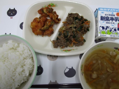 今日の給食は「ごはん,鶏肉のから揚げ野菜あん,菜の花のおひたし,みそ汁」です。