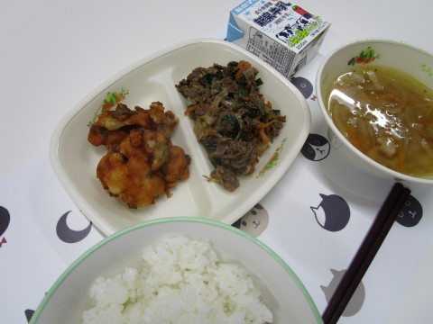 今日の給食は「ごはん,プルコギ,長崎天ぷら,オニオンスープ」です。
