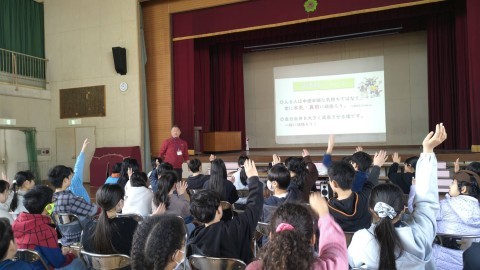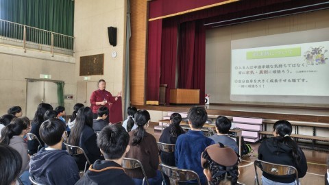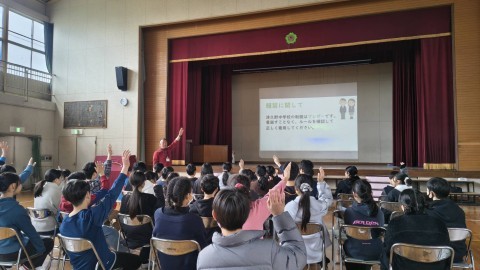 中学校への進学を前に、生徒指導主事の教員が校区の小学校へ出向き心構えやルールなどを話しています。