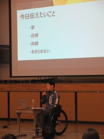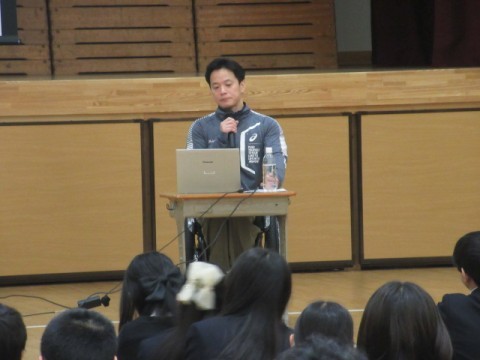 本日は,1,2年生を対象にパラリンピックにも出場(パワーリフティング選手)し,現役選手として活躍している西崎哲男様におこしいただきご講演していただきました。夢をあきらめないこと,目標に向かって努力すること,挫折しても何度でも立ち直れることなど,人生において大切な心構えをたくさん話していただきました。