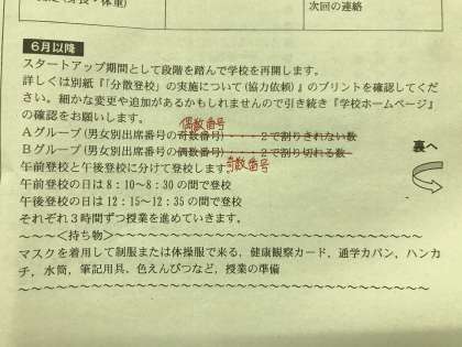 生徒のみなさまには偶数グループ,奇数グループとして登校時には説明しておりますので説明に誤りはありません。詳しくは学校長より出ております『「分散登校」の実施について(協力依頼)』をご覧ください。