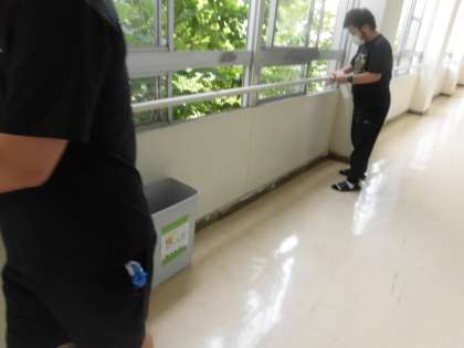 生徒の皆さんが体育の授業の間に先生方が消毒作業をしています。
