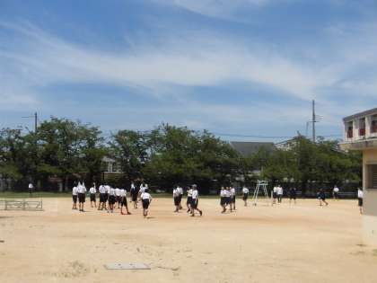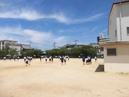 1年生は第2グラウンドで昼休みを過ごしています。 暑いけれどボールや鬼ごっこなどそれぞれのグループに分かれて楽しそうです。