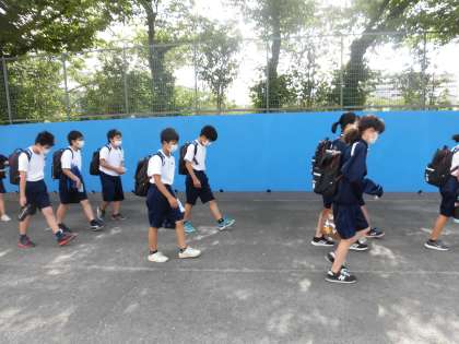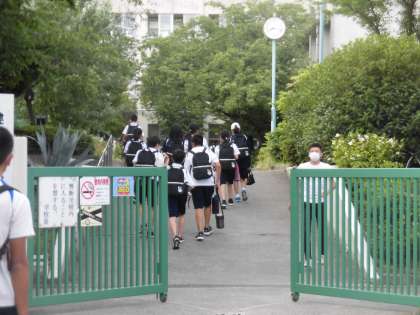 やや狭めに開けている校門付近では自然と少人数になり、登校しています。