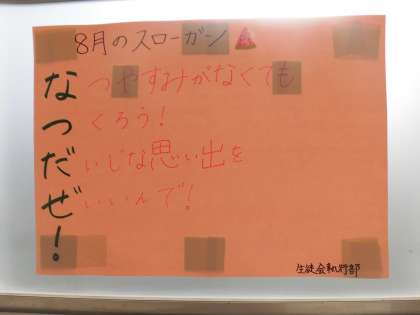 おはようございます。 2年生フロアの生徒会8月のスローガンです。 いろいろなバージョンがあるようです。