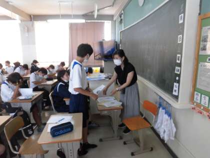 終業式2 公開日 2020/08/07 更新日 2020/08/07 お知らせ 中学校で初めての通知表を渡してもらいます。 「ドキドキする〜」との声も聞こえました。 廊下で一人ずつ先生のお話を聞いてから、渡されるクラスもありました。