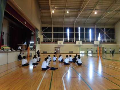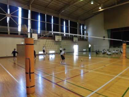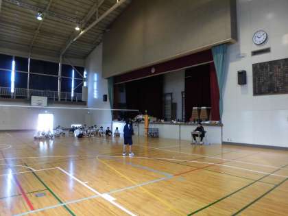 体育館の半分を使って練習し、反対側ではテストが行われています。