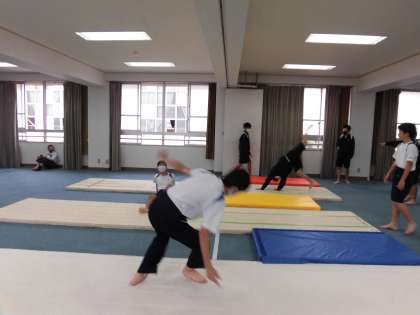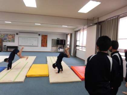 集会室でマット運動、「側転」を練習中です。