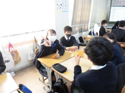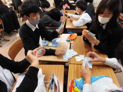 皆さんで協力して、単語が書いてあるカードを配り、学んでいます。
