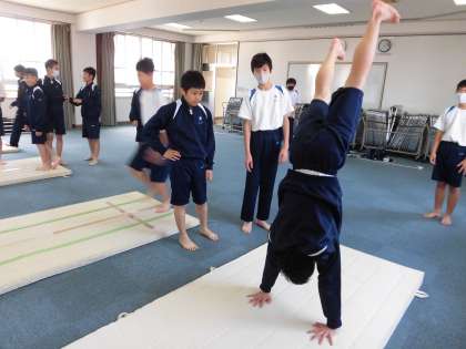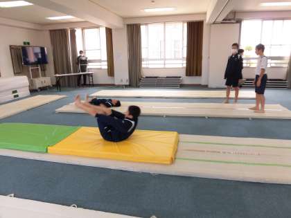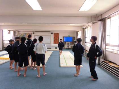 男子体育は集会室でマット運動です。