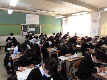 数学の授業です。皆さん集中しています。 コンパスを使って図を描くのは難しそうですが、美しく描いていますね。