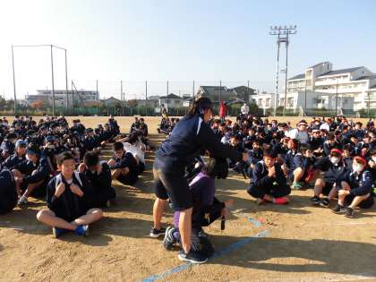 整列して準備万端です! 先生にもクラスカラーのハチマキを着けてくれました。