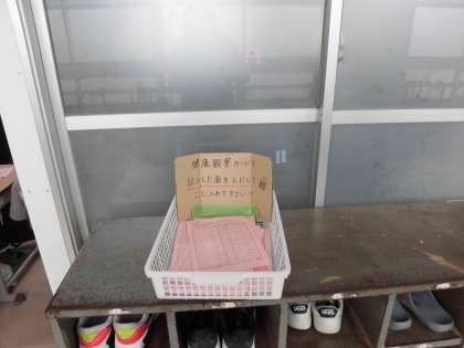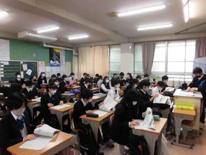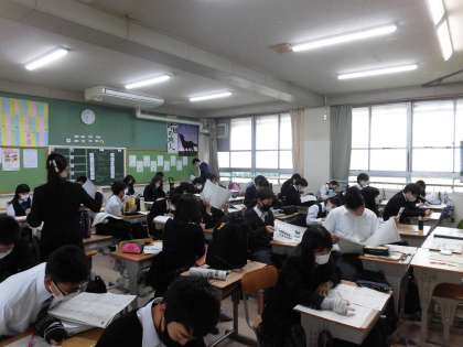 テスト前の朝学活です。 学習委員会が作成してくれた予想問題を配布しているところもありました。