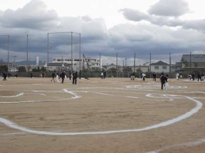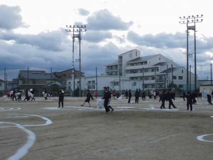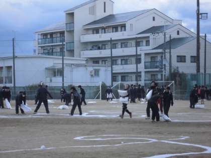 来週の1・2年生クラスマッチを控え、本日グランド利用クラブ生徒でにがり撒きを行いました。皆さん、寒い中ご苦労様でした。