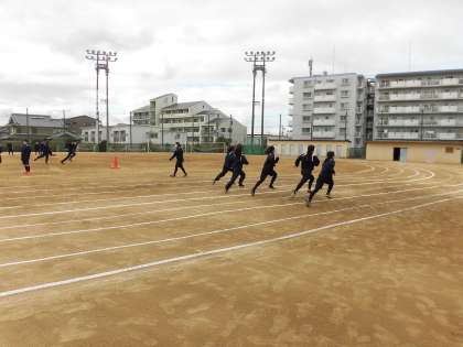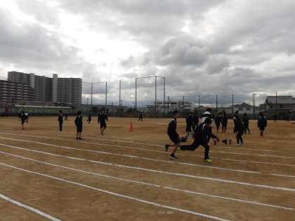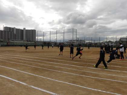 リレーの練習中です。 「タイミング合わせて!」とか「速すぎる!」と声をかけあいながらバトンパスの練習をしていました。
