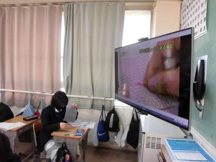 家庭科授業の様子です。 先生の説明と映像で確認しながら丁寧に縫っています。