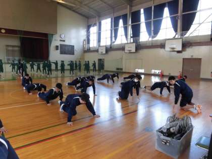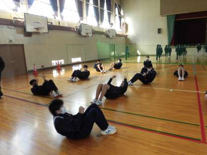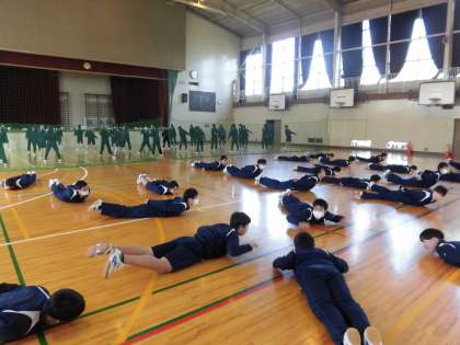男女体育、準備運動中です。
