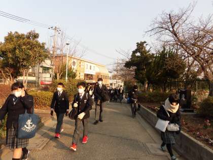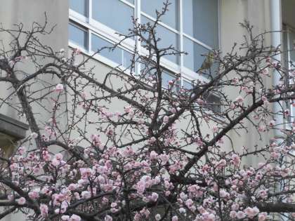 昨日とは違って寒い朝になりましたが、皆さん元気に登校しました。 梅の花が咲いていて、メジロがにぎやかに鳴いています。