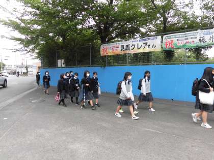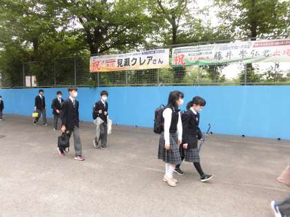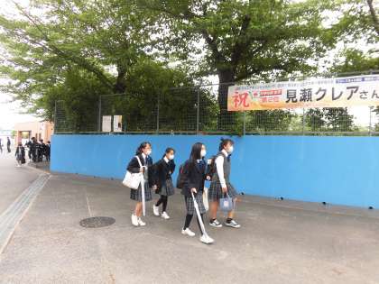 登校の様子です。 「曇りのち雨」の天気予報だったので、傘を持っている人も多いようです。