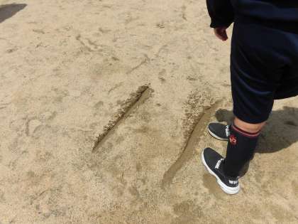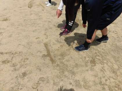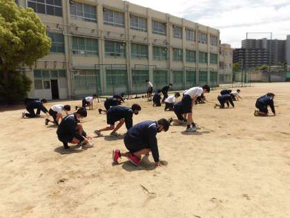 先生の説明を聞いた後、足の幅1と半分の線を引き、各自で練習しています。