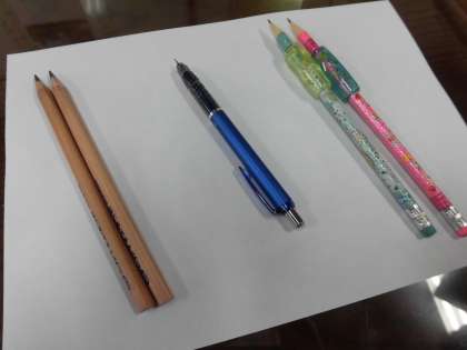 左から、持ちやすい鉛筆、折れにくいシャープペンシル、滑りどめをつけた鉛筆です。