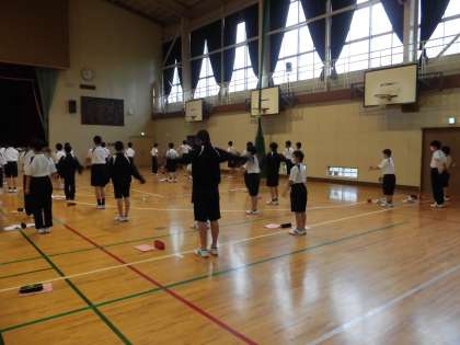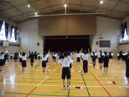 ラジオ体操のテストがあります。 全員で動きの確認を行っていました。